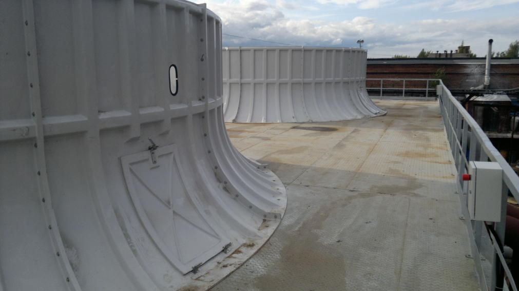 Диффузор поставляется в разобранном виде. Все его сегменты взаимозаменяемы. Диффузоры оснащены технологическим люком для доступа в моторную секцию вентилятора, имеют аэродинамически оптимизированную форму и не требуют дополнительной фиксации на градирне посредством растяжек. Соединительные элементы и фурнитура диффузора выполняются из нержавеющей стали.